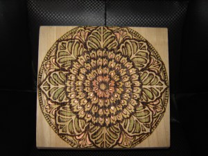5.  Once the wood burning is finished, I had to decide how I was going to paint it.  But I didn’t use regular paint.  I don’t think you can tell from these pics but the inside of the flower petals are bronze leafing (real metal).  The same as gold or silver leaf.  But, this stuff is called “Rubb ‘n Buff”.  It’s real metal leaf but it’s suspended in sort of a wax and can be applied with a paint brush.  It comes in about 15 different finishes and adds a very nice touch.  The rest of the “paint” is actually pigment that…I bought at Michael’s.  I didn’t want an opaque finish because I didn’t want to overwhelm the wood burning.  I watered it down until is was very thin, brushed it on and wiped the excess off with a paper towel.  I’m not sure but regular craft paint should work the same way.
