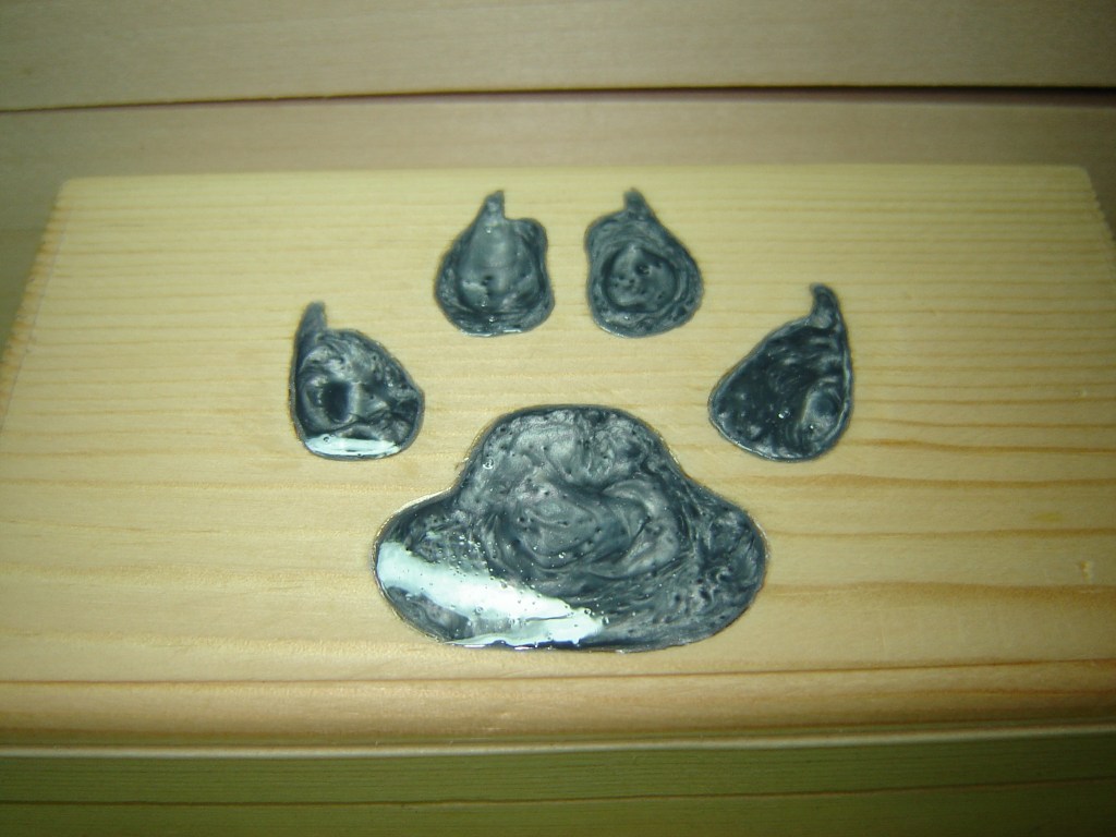 I had a little wooden box, that I’d purchased for a dollar,  that had a lid that was about 1/2 inch think and perfect for my inlay experiment.   I got into my vast supply of clip art books and found a simple dog paw pattern that fit nicely on the lid.  After transferring the clip art onto the lid, I used a Dremel to cut a recess of about 1/4 inch into the lid (I didn’t want to cut through the top because the resin would run out).  After the cutting was finished, I made sure that the lines were clean so after the excess resin was sanded off, a clean inlay would remain.