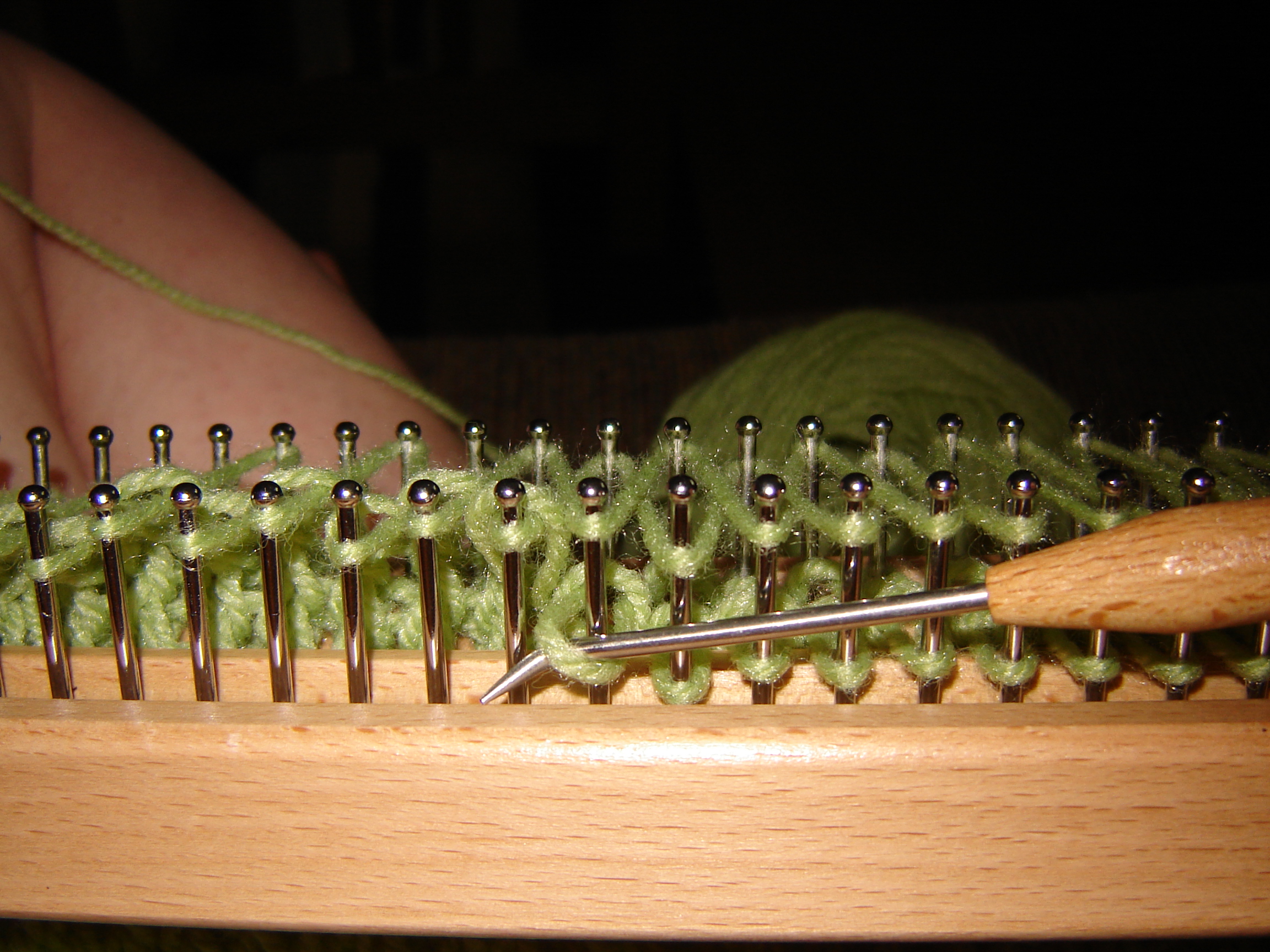 As for how I happened upon this miracle of yarn craft; sometime this past winter, I decided to watch HSN (home shopping network) because it was “Craft Month” and was desperate for something to watch on a Tuesday afternoon. They were highlighting an item called a “knitting board” (2 boards; scarf and baby blanket sized…). I’ve been knitting and crocheting for a long time and never even heard of it before. Since I normally get my best crafting idea’s from obscure TV shows, I was intrigued! Apparently, as the completely fake and plasticized hostess would go onto explain…(this chick had no clue as to what this thing did or was used for…she was as worthless as the hosts/hostesses that just hold the guitars when ESTABAN is on hocking his cheap guitars all while playing barely recognizable songs and they’re trying to look interested…nobody can smile that long!!)…that knitting needles were actually the upgrade to the knitting board due to the ease of transportation. Thus, the knitting board fell to the way side and became a lost art somewhere around the time where being a Quaker in the US wasn’t mandatory. However, due to the unique “double knit” result of this technique, there has recently been a resurgence in popularity within the crafting community. Blah blah blah and the plastic lady was starting to piss me off. However, when they showed the finished product I had to buy both of them!!