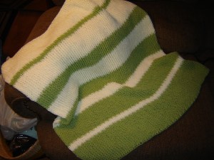 But, there is an amazing aspect to this blanket!! It’s as fluffy as a bag of cotton balls!! The double sided knit creates a fabric that is nothing short of luxuriously soft and light! It’s so fluffy that it fluffs to about 1/2 thick but compresses to nothing if you pinch it lightly. If it gets a snag, you just yank on it and it goes back into shape. I almost wish I had the patience to create a whole afghan with it…but I don’t and it would take too long to do and then I wouldn’t be able to blog about the projects I make because a king sized afghan would take way too freakin’ long to do (plus it got up to 87 degrees today and the LAST thing I want to do is bury myself under “pile o’ yarn” for the sake of a winter project). I wish blogs could be touch sensitive because words can’t describe how amazing this thing feels. I’ve made 20 some-odd baby blankets but this is my second on the knitting board.