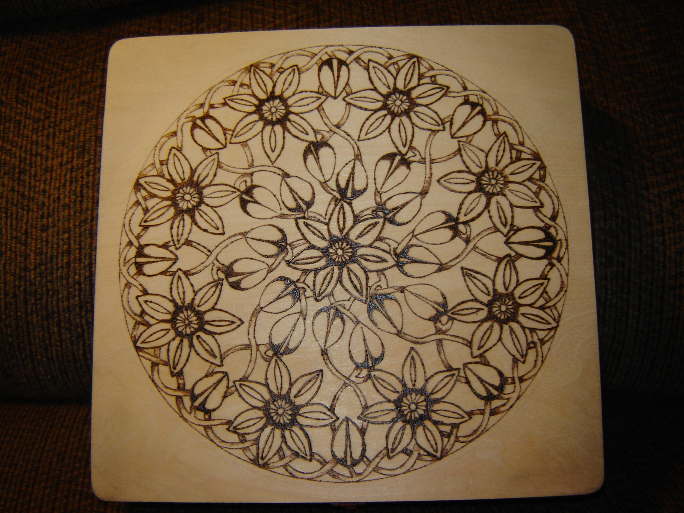 Then I used the sharpest point on my wood burner and outlined the pattern on the box.