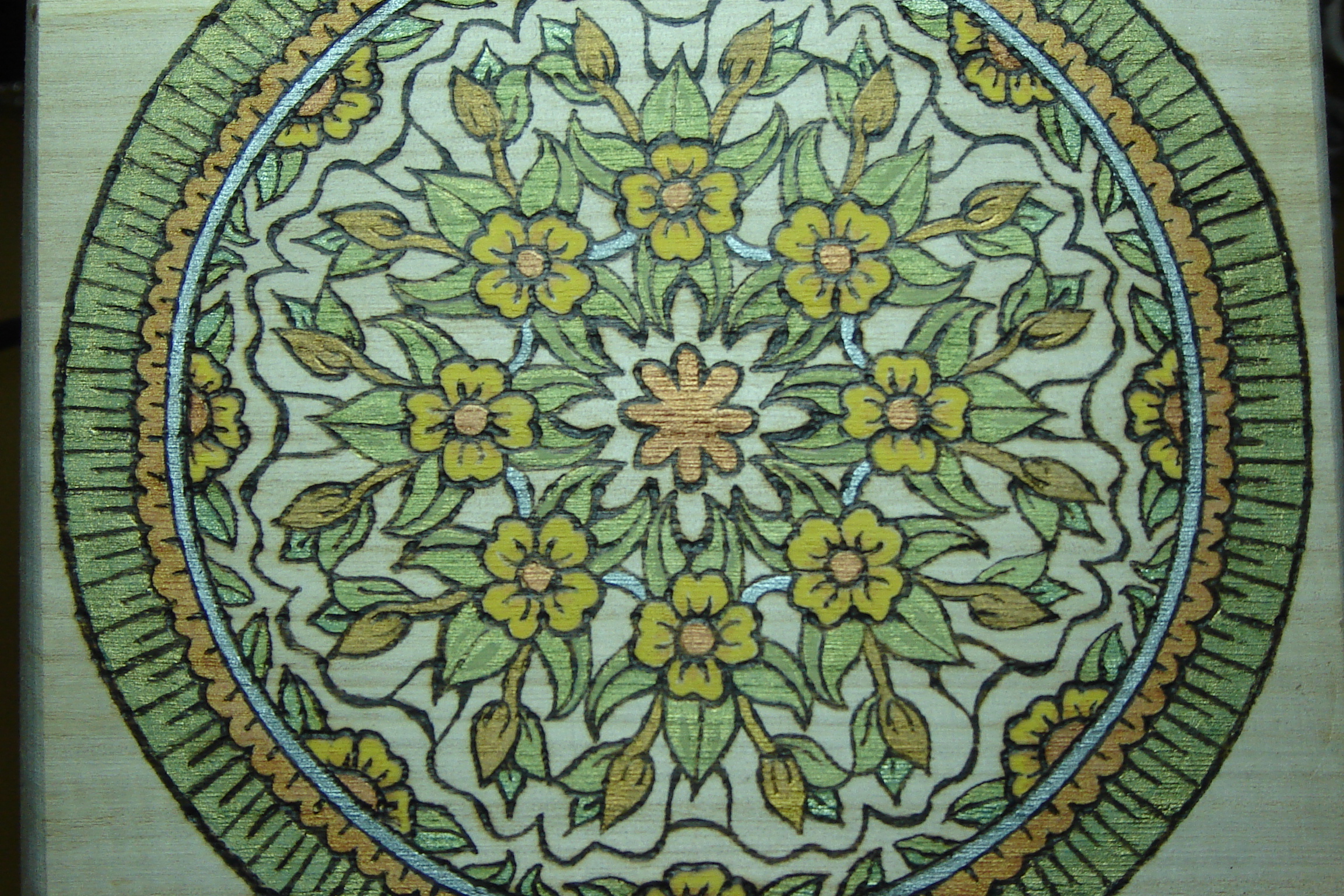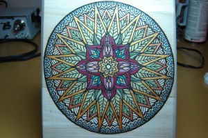 5.  Once the wood burning is finished, I had to decide how I was going to paint it.  But I didn’t use regular paint.  I don’t think you can tell from these pics but the inside of the flower petals are bronze leafing (real metal).  The same as gold or silver leaf.  But, this stuff is called “Rubb ‘n Buff”.  It’s real metal leaf but it’s suspended in sort of a wax and can be applied with a paint brush.  It comes in about 15 different finishes and adds a very nice touch.  The rest of the “paint” is actually pigment that…I bought at Michael’s.  I didn’t want an opaque finish because I didn’t want to overwhelm the wood burning.  I watered it down until is was very thin, brushed it on and wiped the excess off with a paper towel.  I’m not sure but regular craft paint should work the same way.